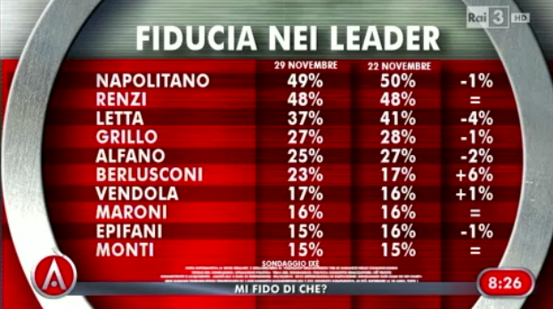 Divertente però il mondo a base perduecentosettantaduale: a escludere i non candidati e a prendere le coalizioni di febbraio, si fidano dei leader di una coalizione il 117% del campione, dell’altra il 48% e via a scendere. A escludere i non candidabili, il 48% scende al 25%. Se si applicasse il regolamento del PD, Letta è alla quarta legislatura (ma già ministro nel 1998 + deputato europeo nel 2004), quindi dovrebbe già essere affaccendato altrove, ma magari decidono capricciosamente di applicarlo alla prossima, allora anche il primo blocco si riduce potenzialmente all’80% della fiducia (buttalo via).